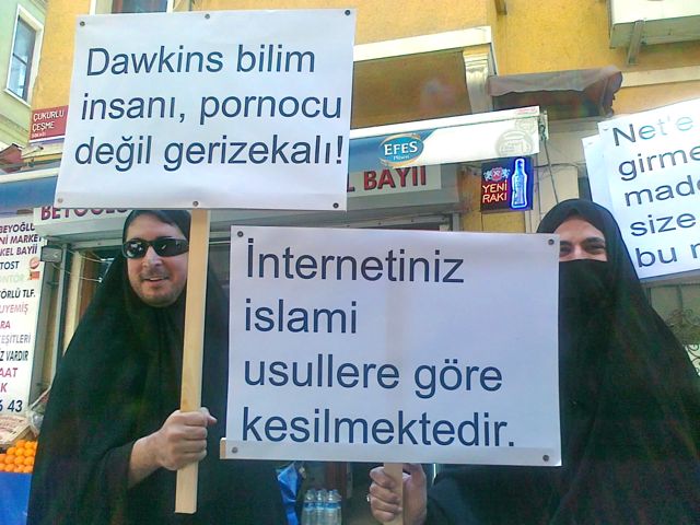 Turkish men dressed in chadors get ready for the ‘Hands Off My Porn’ protest against internet censorship on Istiklal St in Istanbul, 2011