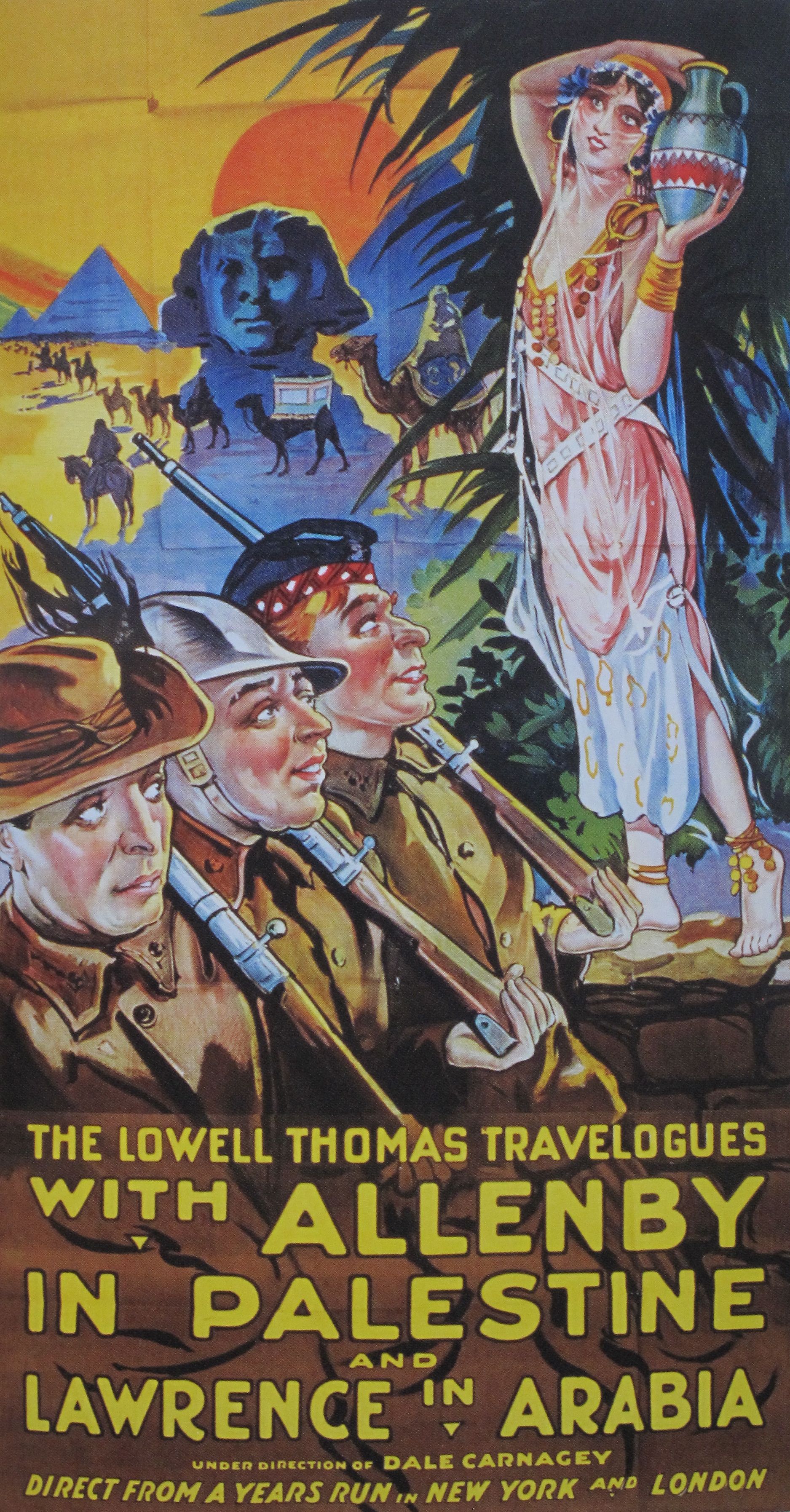 The resulting show, eventually entitled With Allenby in Palestine and Lawrence in Arabia, was only ready in 1919, after the war was over. After a modest beginning in New York, the lecture tour became a sensation in the English-speaking world, with two thousand performances over four years. It was a true feast for the Orientalist imagination. In London, the promoters borrowed a “Moonlight on the Nile” scene from an opera set, a Dance of the Seven Veils was performed, and an Irish tenor off-stage sang a musical version of the Muslim call to prayer. Aldington says this was irresistible to a British public still in shock from the war:
