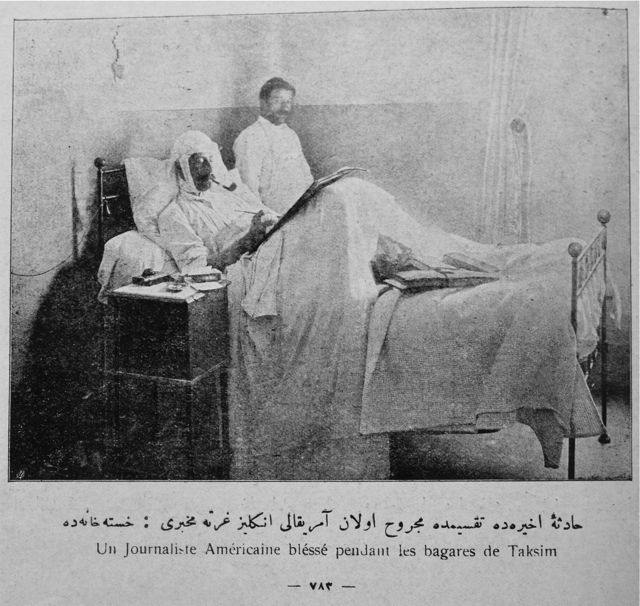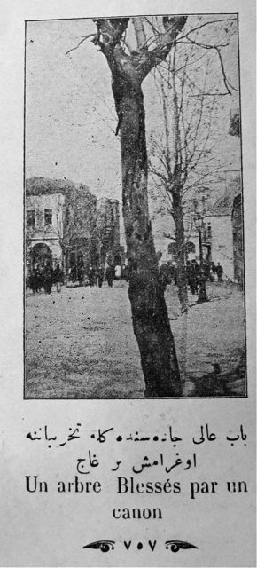 Most of these photos come from a May 1909 copy of the Ottoman “Resimli Kitab” (‘Picture Book’) magazine, a random volume I inherited from the late French writer Jean-Pierre Thieck, who must have found it in a flea market and realised that the events described in it would one day be relevant again. The big photo below shows how even back then, the international media was in the thick of things. This reporter certainly conducted himself with some style, and was no doubt also accused of being behind all the trouble. And yes, as on the left, there was an environmental angle too, with a picture of a tree that got damaged by the shelling.