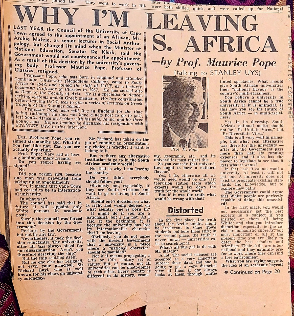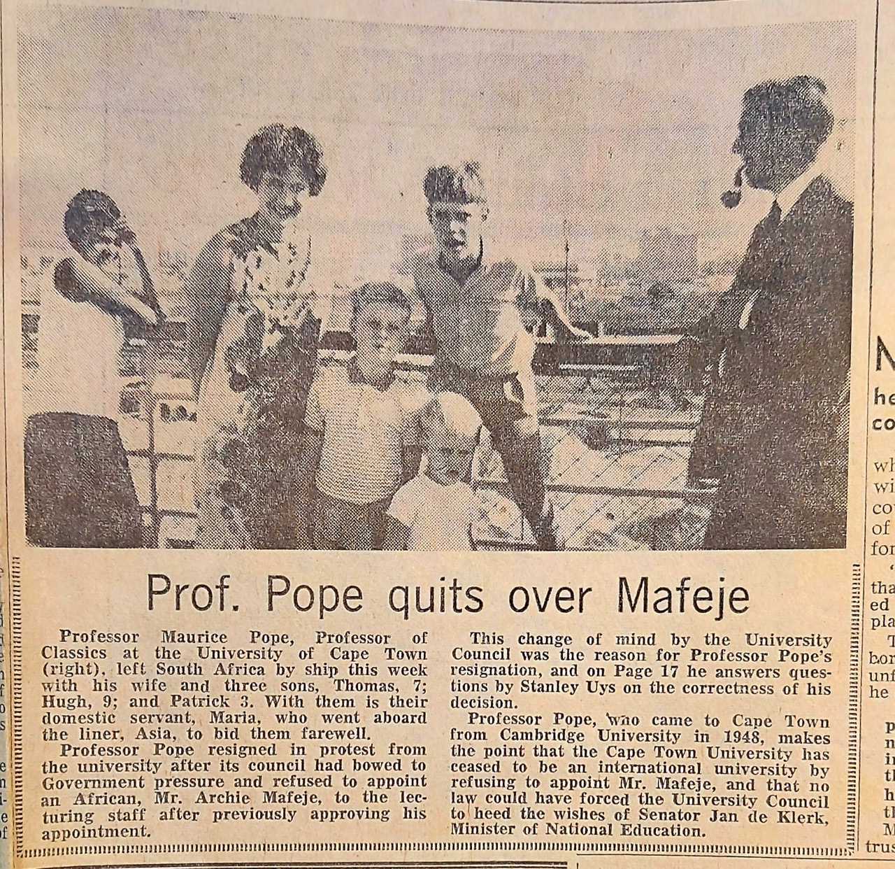 Professor Pope, who will live in England for the time being (although he does not have a new post to go to yet) left South Africa on Friday with his wife Janna [Johanna], and his three young sons. Before leaving he discussed his resignation with STANLEY UYS in this interview.