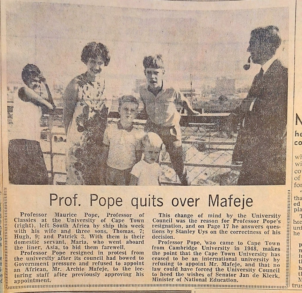 Fifty-two years ago, my family left South Africa by ship from Cape Town harbour. My British father and mother, Maurice & Johanna Pope, had lived and worked there for 20 and 15 years respectively, and had no doubt that they were doing the right thing in taking their leave. They felt they couldn’t stay after my father resigned his much-loved post at as a Professor of Classics at the University of Cape Town. He was protesting the fact that his university had, under pressure from the then apartheid government, withdrawn the offer of a senior lectureship in African studies it had made to to a Black South African, Dr. Archie Mafeje.