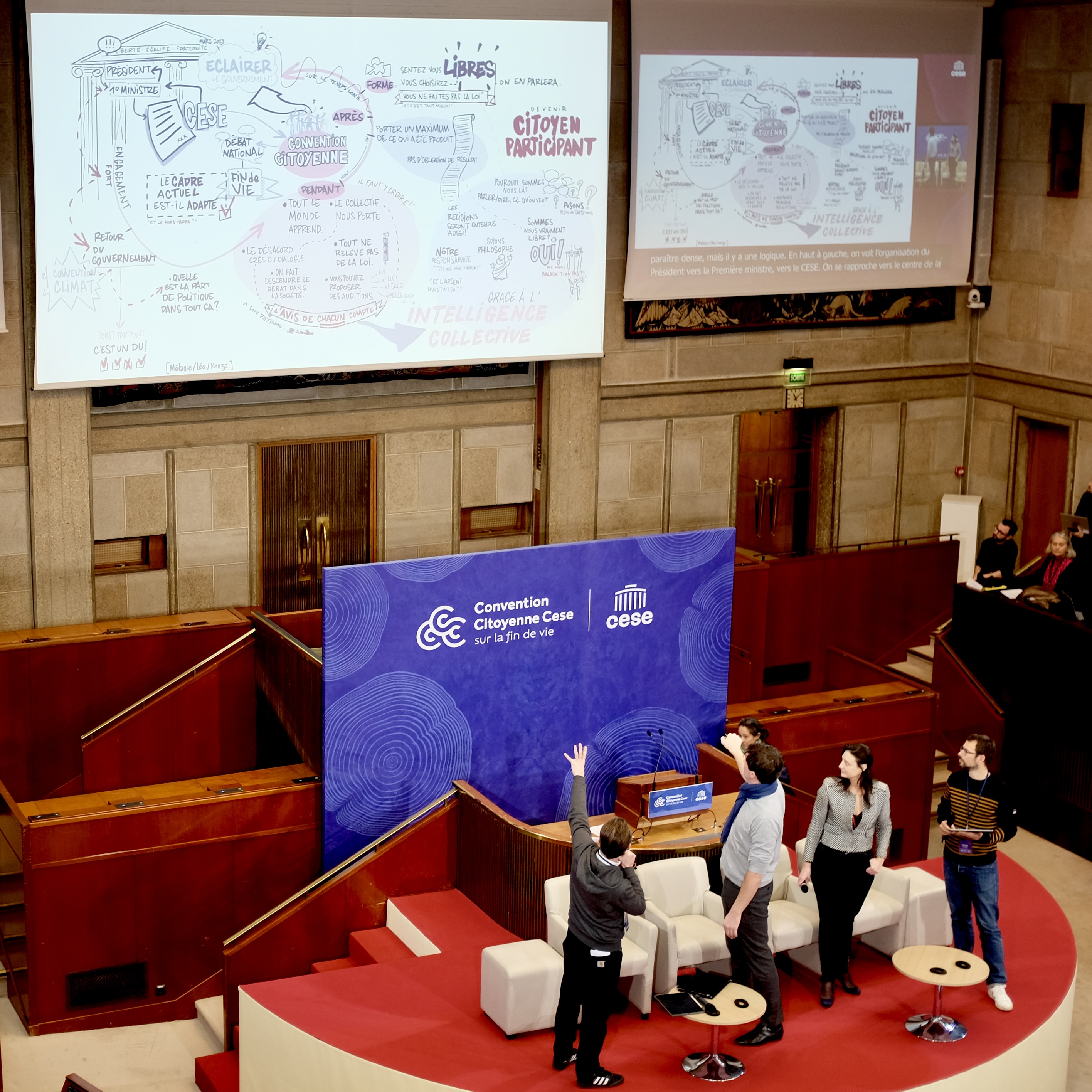“You are here in a place in which new forms of democracy are being invented and developed … and of them the Citizen Convention is without doubt the most ambitious, the most demanding and the most engaging,” participants were told by CESE’s president, Thierry Beaudet. “It’s impossible to do this [deliberation] on the scale of a country, so you’re going to do it for us, for the whole of society … This is the basis of both your legitimacy and our trust in you.”