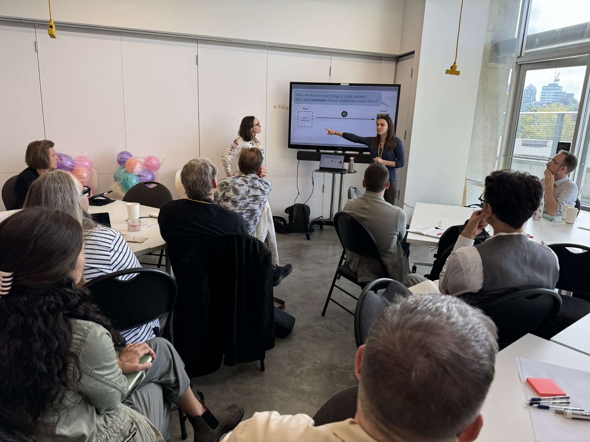 - Create a large number of possible, stratified assemblies from the pool of acceptances by candidates, then choose one of them from a hat. This makes the final selection of any single individual fairer. The German parliament did something like this with the final selection of its new Citizens’ Assemblies. MIT professor Bailey Finnigan (speaking to audience above) also designed a scientific algorithm to even out an individual’s chances of selection – which she charmingly called the “Goldilocks” method.